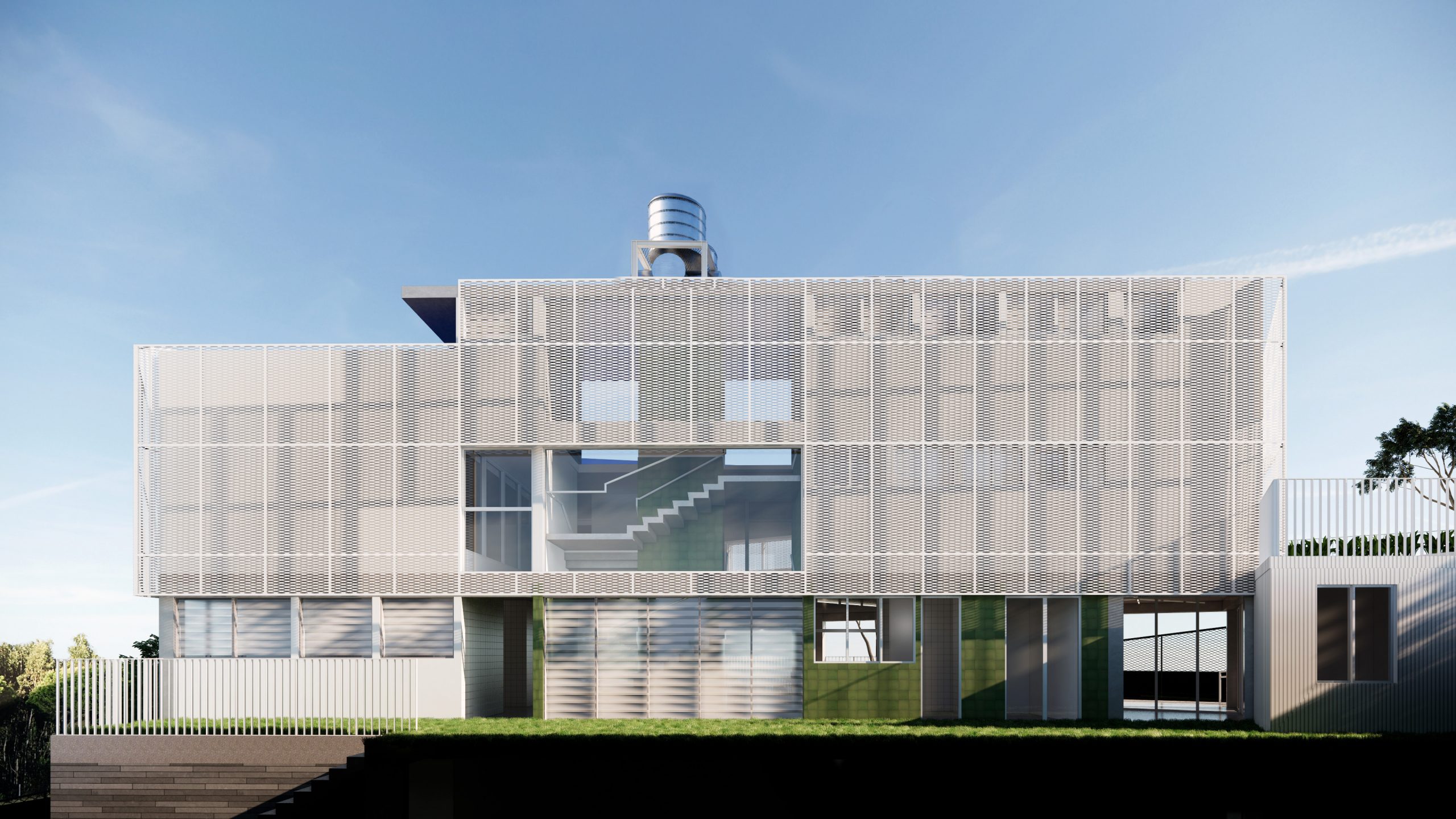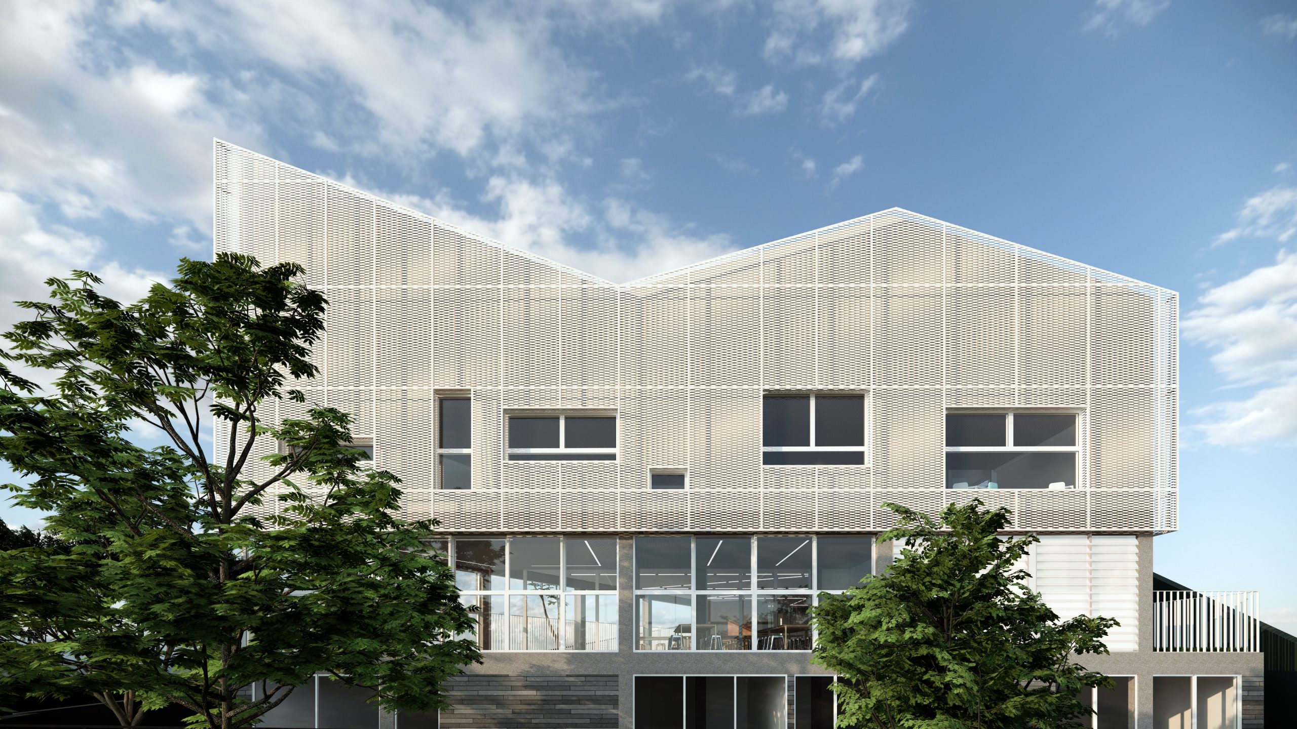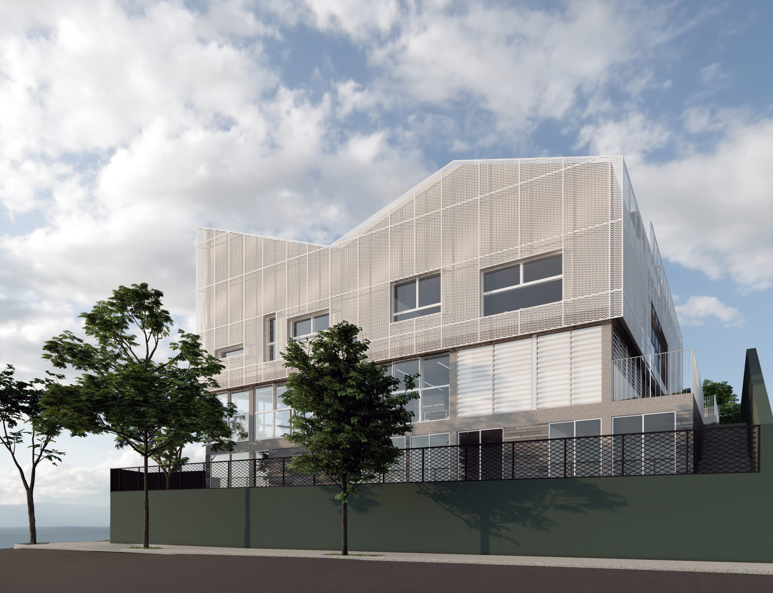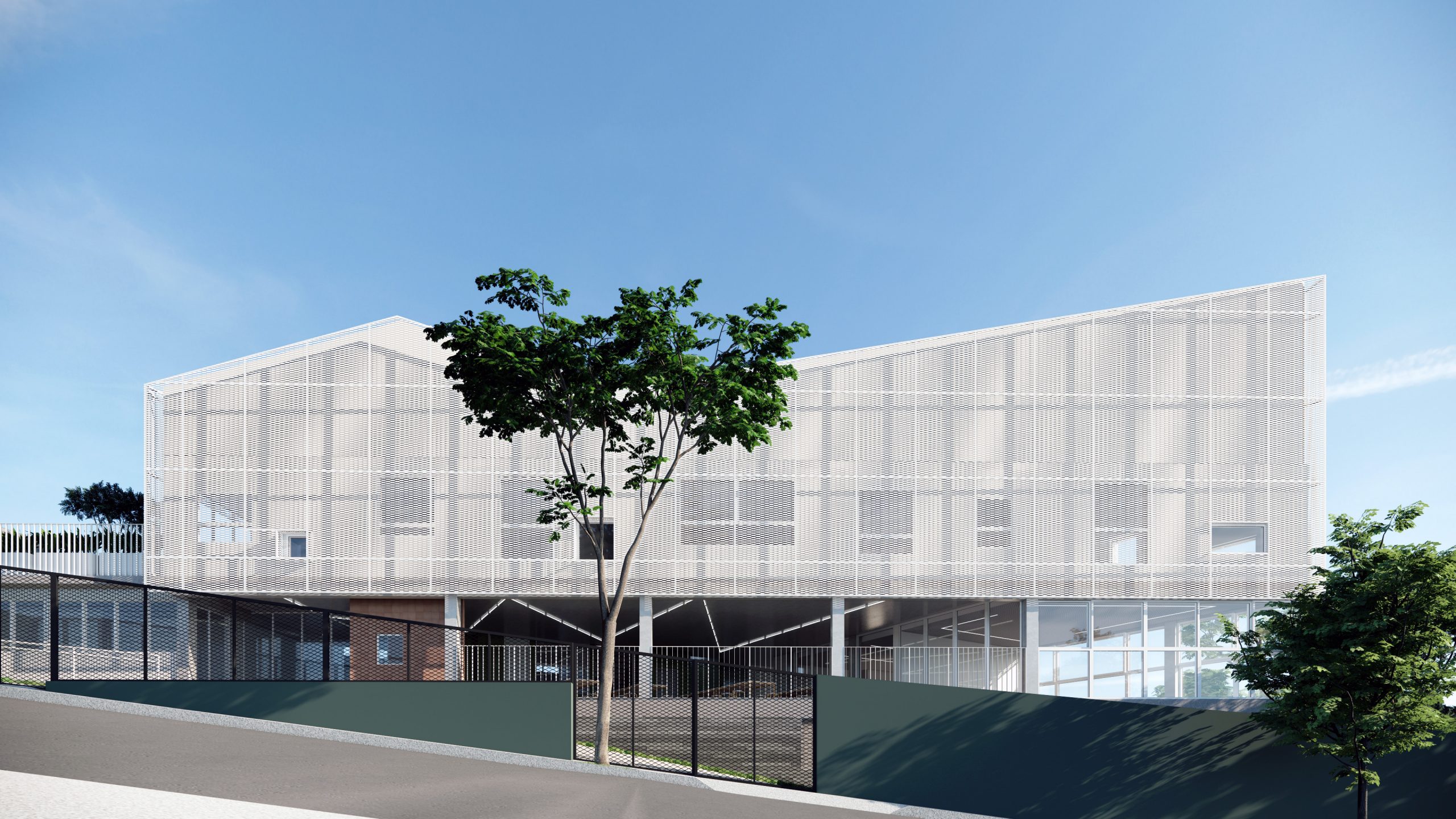 O imponente edifício, um grande bloco revestido com brises metálicos, não apenas encanta visualmente, mas também incorpora funcionalidades essenciais. Os brises, além de conferirem um design contemporâneo, proporcionam conforto térmico, economia de energia e um ambiente propício ao aprendizado. O edifício parece flutuar sobre o platô, onde se encontram áreas essenciais como o pátio, laboratório e biblioteca.