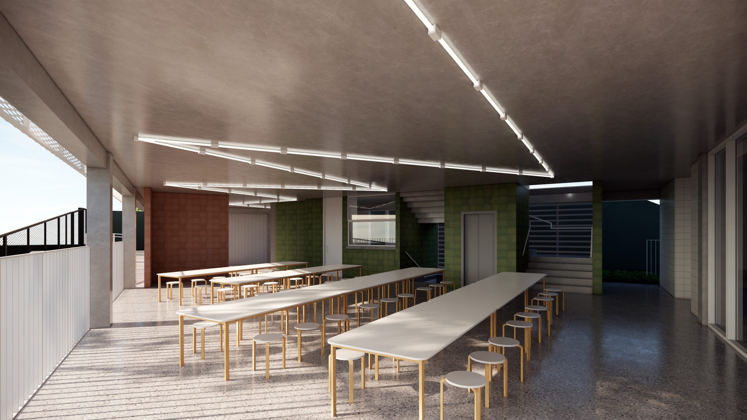 O quarto andar, representado por um terraço azul, desempenha um papel multifuncional na nova sede. Servindo como quadra, o espaço também se transforma em palco para eventos especiais da escola.